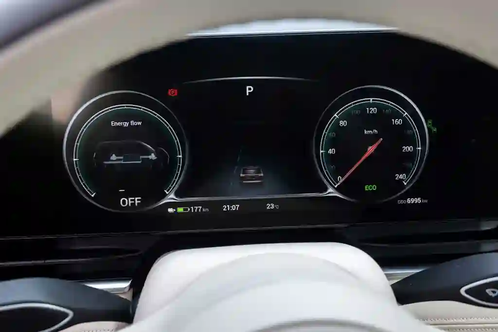 Две модификации, конечно, не две вселенных, но разница принципиальная: первый вариант, использующий в качестве энергии одно электричество, и компромиссный вариант для тех, кто не готов остаться без спасательного круга в виде ДВС, помогающего электродвигателям; причем работать он может как в режиме параллельного, так и последовательного гибрида. На EV запаса хода хватит максимум на 482 км, но это паспортные данные. А на деле после 280 км пробега индикатор показал, что батарея высажена на 66 %. Не так плохо, учитывая, что ехал я по дороге со значительным перепадом высот и трафиком разной интенсивности. Но и температура за бортом не падала ниже 23 градусов, а зимой в морозы добиться подобных результатов будет значительно сложнее. Гибридный автомобиль предложит максимальный совокупный пробег в 750 км без дозаправки и подзарядки. На одной электротяге — 82 км. Но это максимально возможный пробег. После 240 км приборы показывали, что и топливо, и энергия закончатся на отметке в 580 км. Зарядка в гибриде — по стандарту Gb/T. Таких станций немного, лучше иметь переходник, и заряжаться от 5 до 100 % придется 4,5 часа. Успокаивает, что эту операцию можно проделывать не часто.