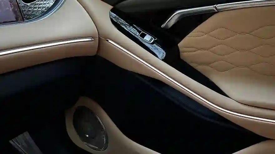 Салон может быть отделан в трех цветовых гаммах. Даже банально черный интерьер разбавлен синими вставками и нескучен, не говоря уж о бежево-синем и красно-бежевом. Все это еще и подчеркнуто контурной подсветкой.