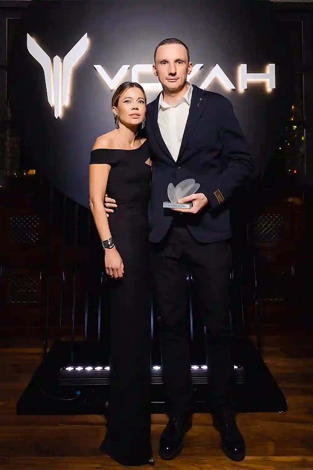 Специальный подарок от VOYAH вручил предпринимателям Антону и Елене Пинским, Алексей Ледков, директор департамента дистрибуции VOYAH.
